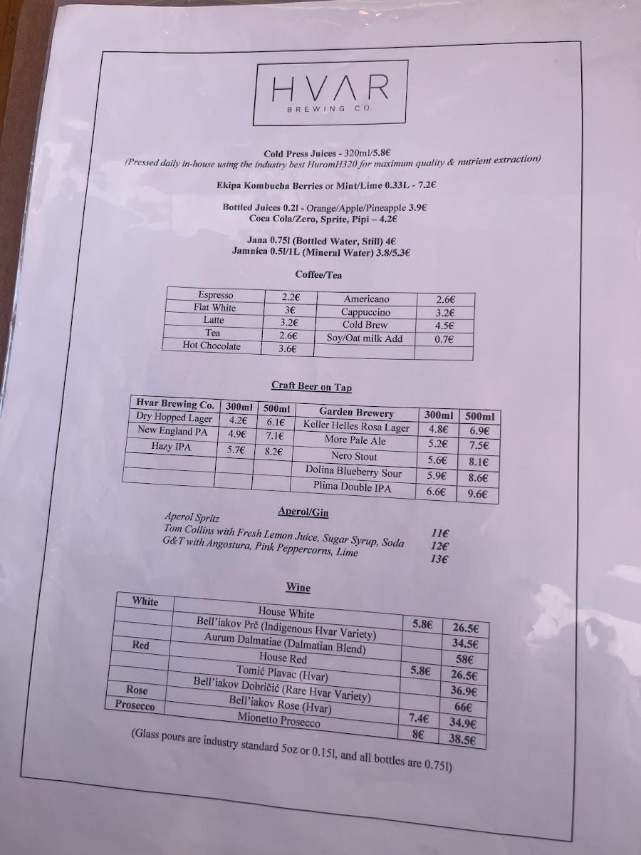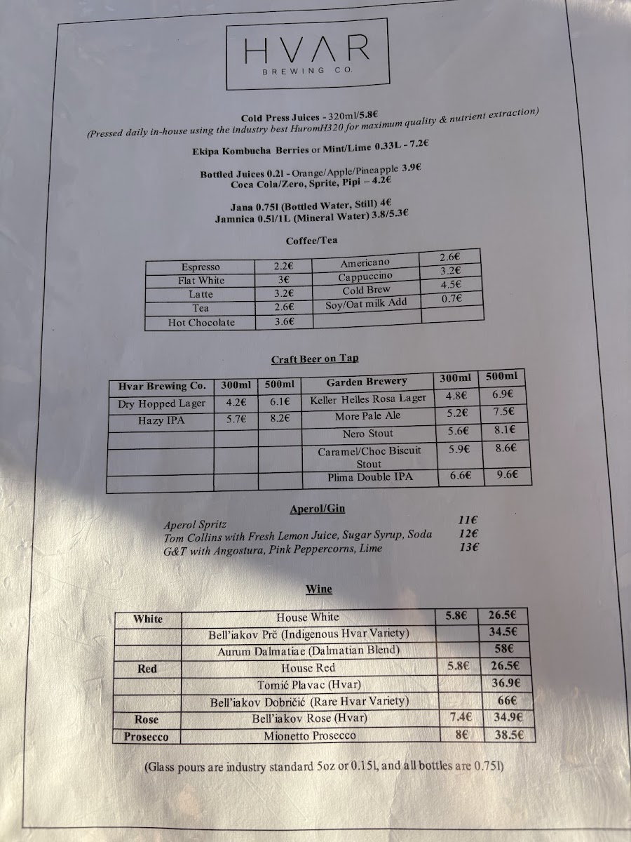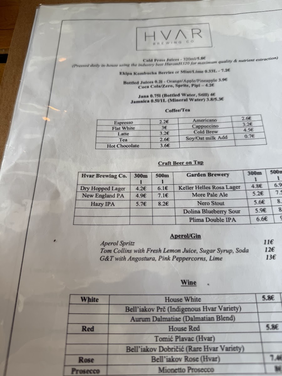 Hvar Brewing Co. Menu