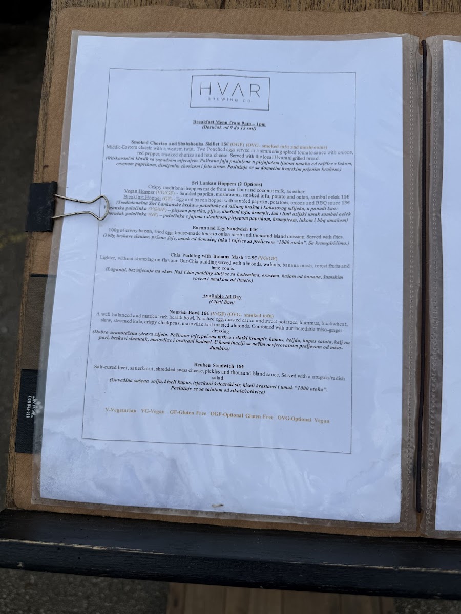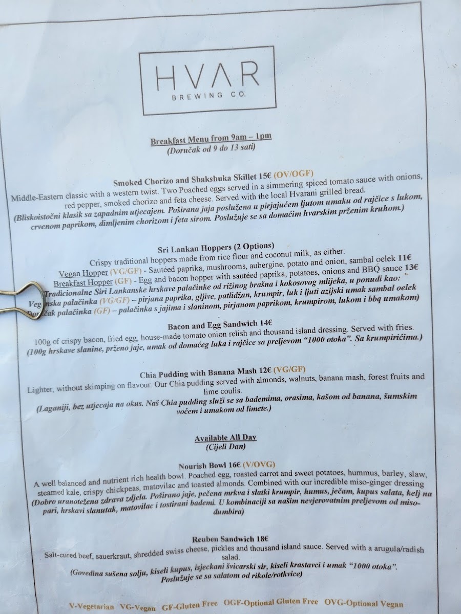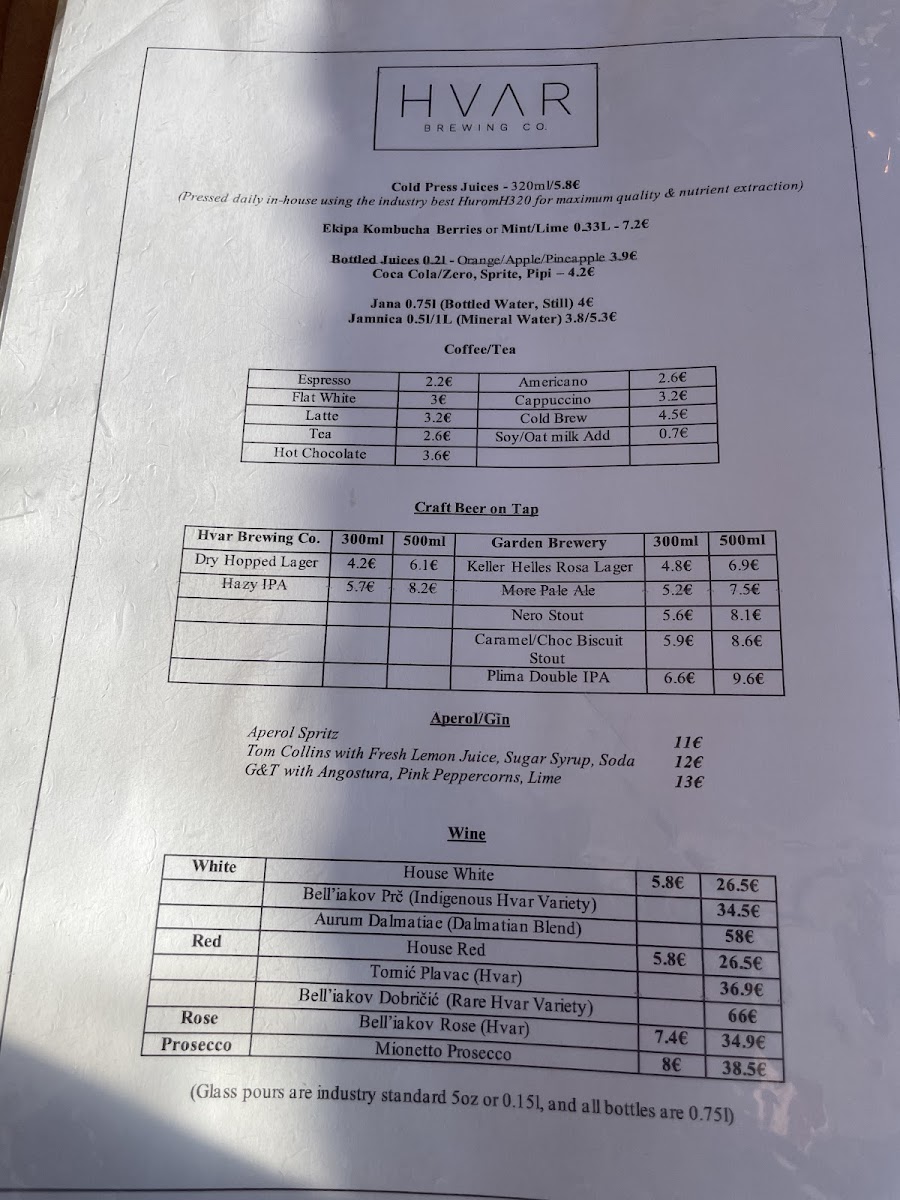 Hvar Brewing Co. Menu